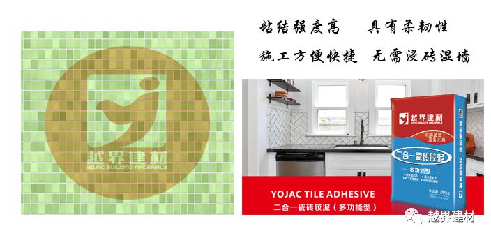 越界二合一瓷砖胶(多功能型)涂层薄、用量少、施工简便,不需添加任何助剂,只要加一定量的水搅匀即可使用,白色粉末不易污染瓷砖,马赛克等饰面,贴砖勾缝一次完成,方便简单,节约成本。防止地面大理石透底。