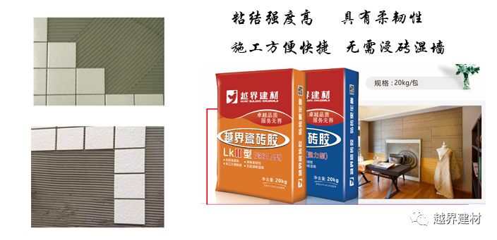 按照国家标准推出的越界瓷砖胶LKI型是一种聚合物改性的水泥基瓷砖胶粘剂能很好的解决新型瓷砖密度高、吸水率低产生的粘结脱落问题,使用越界瓷砖胶LKI型(强力型)瓷砖胶即可完美解决瓷砖铺贴问题,且耐老化、耐高温、环保无毒、不易空鼓。